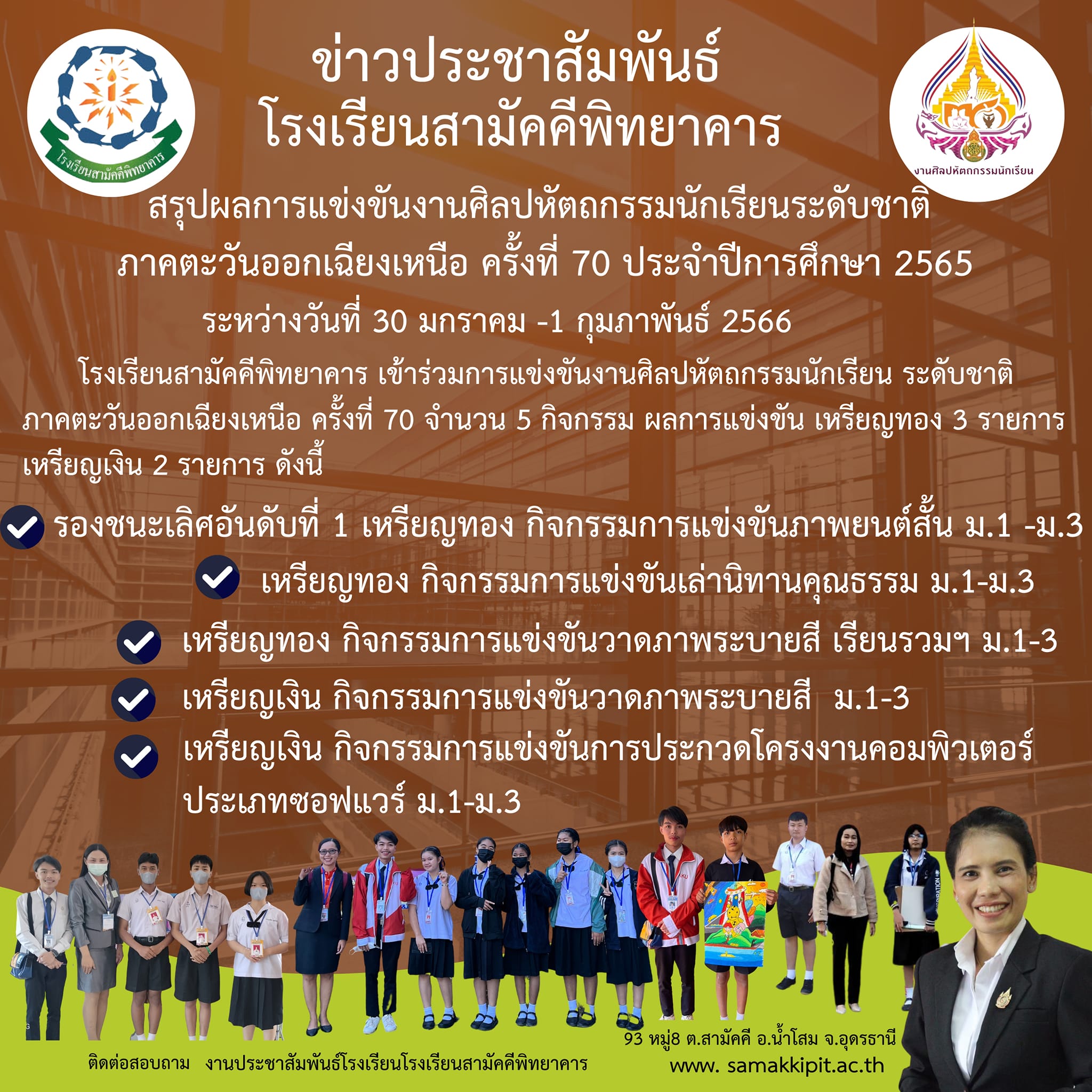 โรงเรียนสามัคคีพิทยาคาร เข้าร่วมการแข่งขันงานศิลปหัตถกรรมนักเรียน ระดับชาติ ภาคตะวันออกเฉียงเหนือ ครั้งที่ 70 จำนวน 5 กิจกรรม ผลการแข่งขัน เหรียญทอง 3 รายการ เหรียญเงิน 2 รายการ ดังนี้