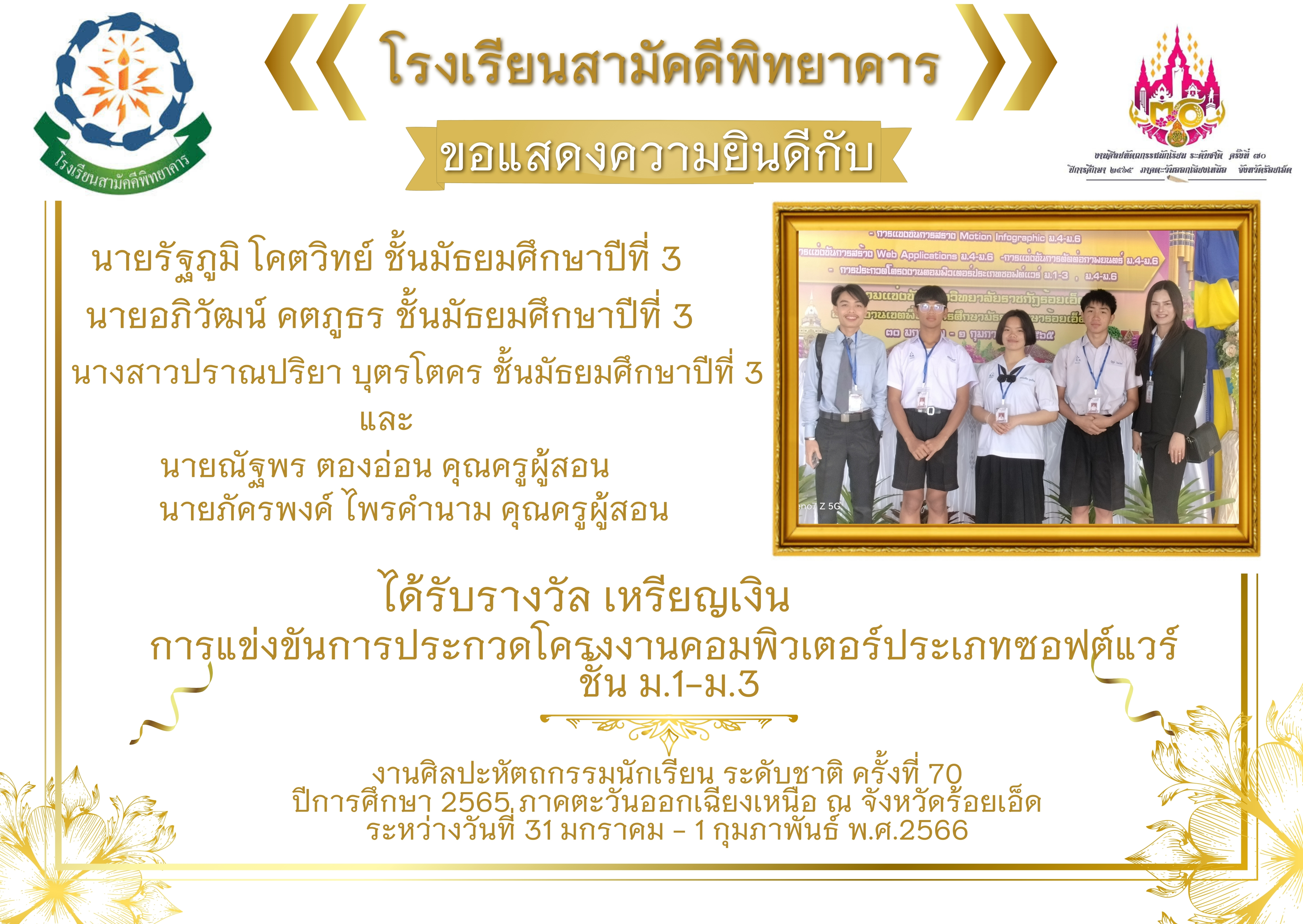 โรงเรียนสามัคคีพิทยาคาร ขอแสดงความยินดีกับนักเรียนและคณะครูผู้สอน ได้รับรางวัล เหรียญเงิน กิจกรรมการแข่งขันประกวดโครงงานอมพิวเตอร์ ประเภทซอฟแวร์ ม.1-ม.3