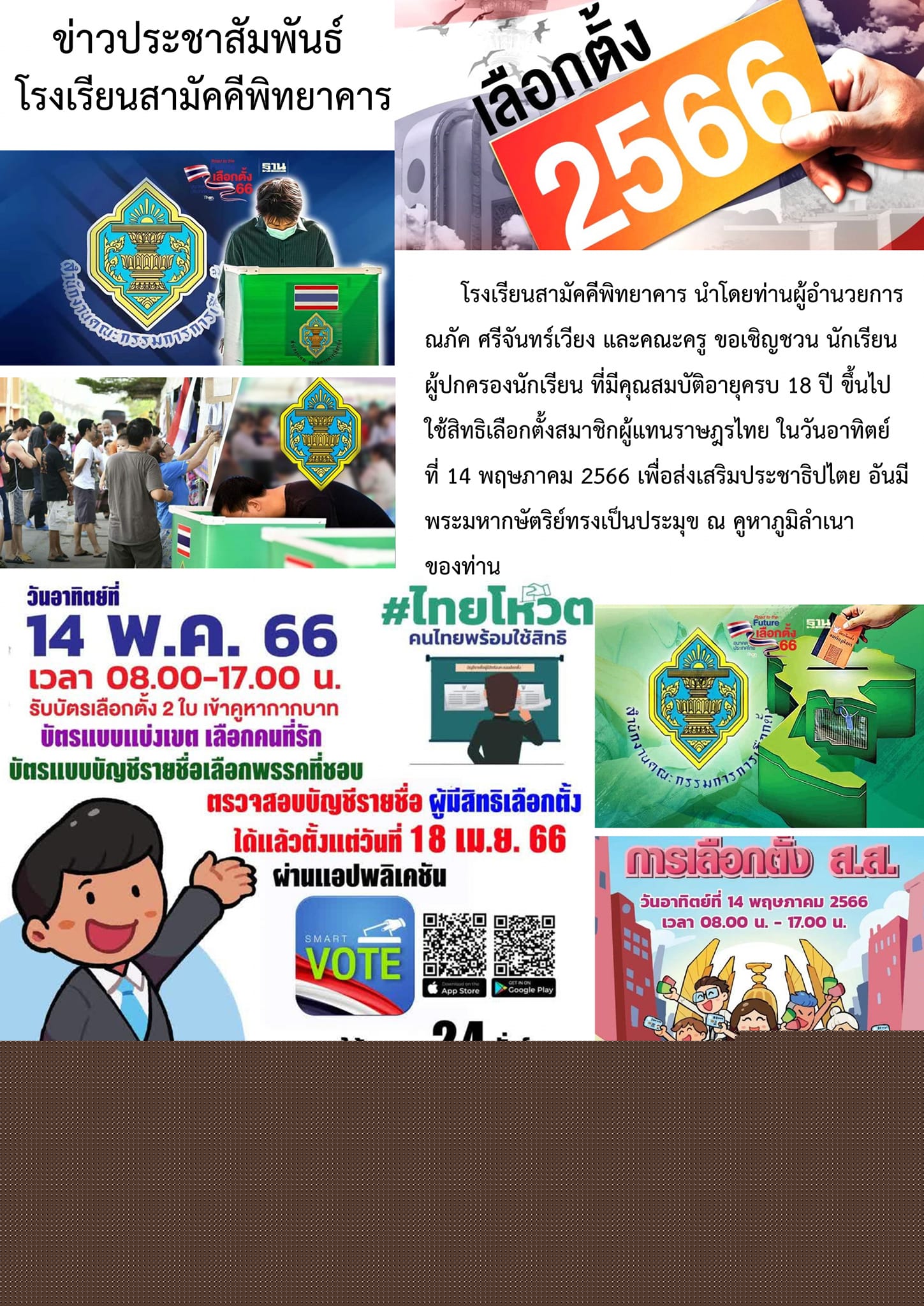 ข่าวสารประชาสัมพันธ์ โรงเรียนสามัคคีพิทยาคาร ขอชิญชวน นักเรียน /ผู้ปกครองนักเรียน ใช้สิทธิเลือกตั้งสมาชิกผู้แทนราษฎร์ไทย ในวันอาทิตย์ ที่14 พฤษภาคม 2566 เวลา 08.00-17.00 ณ คูหาภูมิลำเนาของท่าน