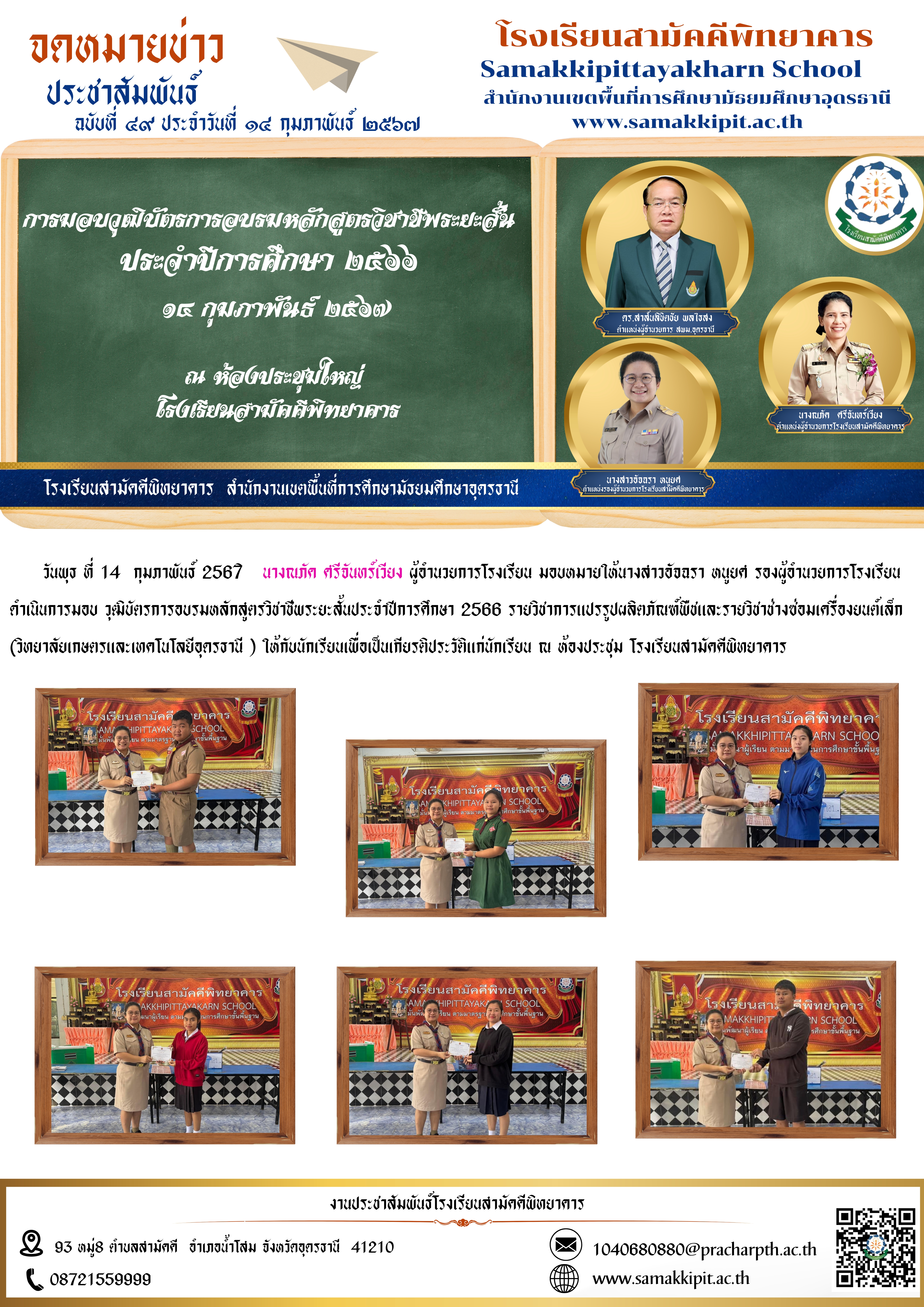วันพุธ ที่ 14  กุมภาพันธ์ 2567 นางณภัค ศรีจันทร์เวียง ผู้อำนวยการโรงเรียน มอบหมายให้นางสาวอัจฉรา หนูยศ รองผู้อำนวยการโรงเรียน ดำเนินการวันพุธ ที่ 14  กุมภาพันธ์ 2567ิ  นางณภัค ศรีจันทร์เวียง ผู้อำนวยการโรงเรียน มอบหมายให้นางสาวอัจฉรา หนูยศ รองผู้อำนวยการโรงเรียน ดำเนินการมอบ วุฒิบัตรการอบรมหลักสูตรวิชาชีพระยะสั้นประจำปีการศึกษา 2566 รายวิชาการแปรรูปผลิตภัณฑ์พืชและรายวิชาช่างซ่อมเครื่องยนต์เล็ก (วิทยาลัยเกษตรและเทคโนโลยีอุดรธานี ) ให้กับนักเรียนเพื่อเป็นเกียรติประวัติแก่นักเรียน ณ ห้องประชุม โรงเรียนสามัคคี ให้กับนักเรียนเพื่อเป็นเกียรติประวัติแก่นักเรียน ณ ห้องประชุม โรงเรียนสามัคคี
