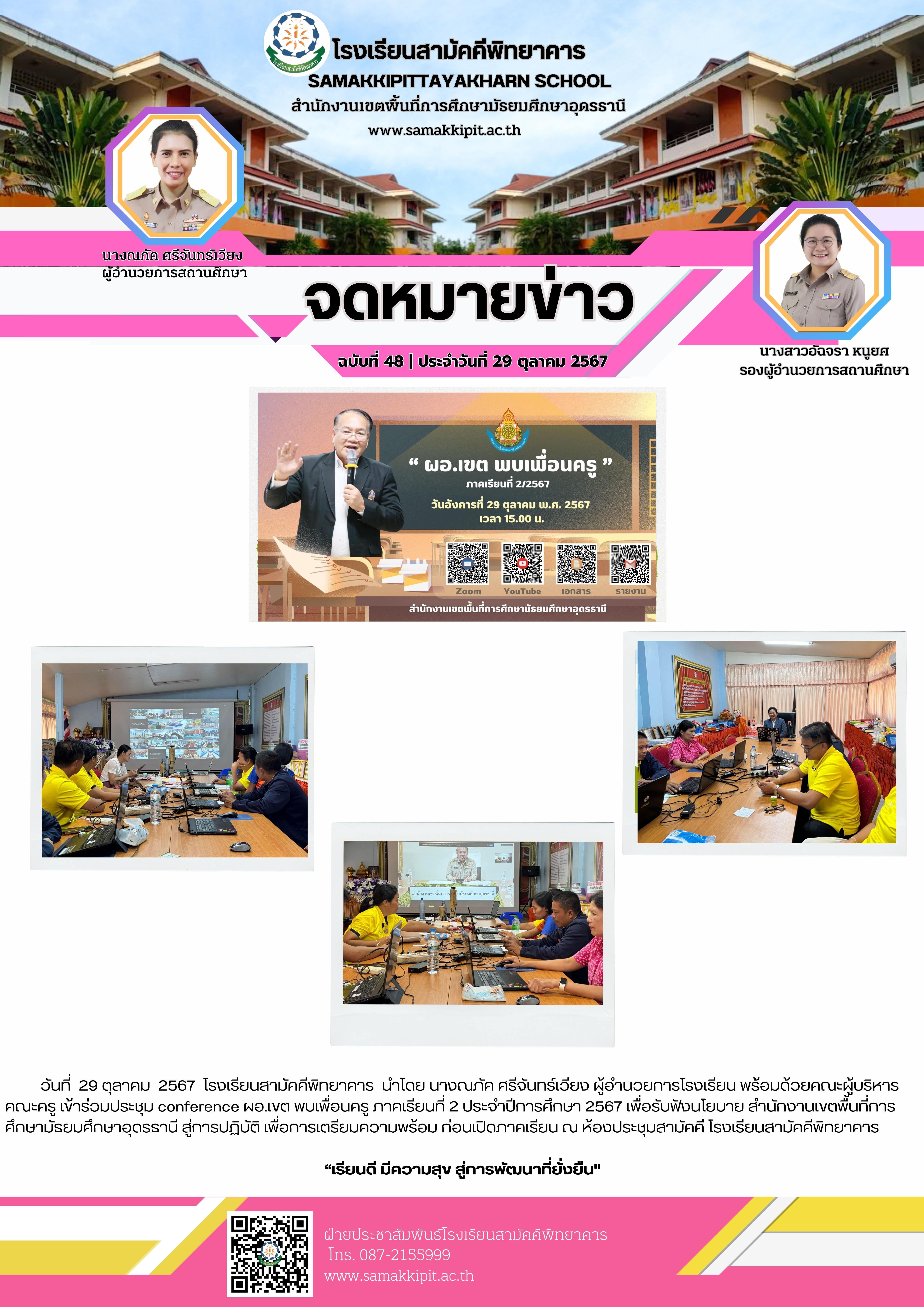 วันที่ 29 ตุลาคม 2567 โรงเรียนสามัคคีพิทยาคาร นำโดย นางณภัค ศรีจันทร์เวียง ผู้อำนวยการโรงเรียน พร้อมด้วยคณะผู้บริหาร คณะครู เข้าร่วมประชุม conference ผอ.เขต พบเพื่อนครู ภาคเรียนที่ 2 ประจำปีการศึกษา 2567 เพื่อรับฟังนโยบาย สำนักงานเขตพื้นที่การศึกษามัธยมศึกษาอุดรธานี สู่การปฏิบัติ เพื่อการเตรียมความพร้อม ก่อนเปิดภาคเรียน ณ ห้องประชุมสามัคคี โรงเรียนสามัคคีพิทยาคาร