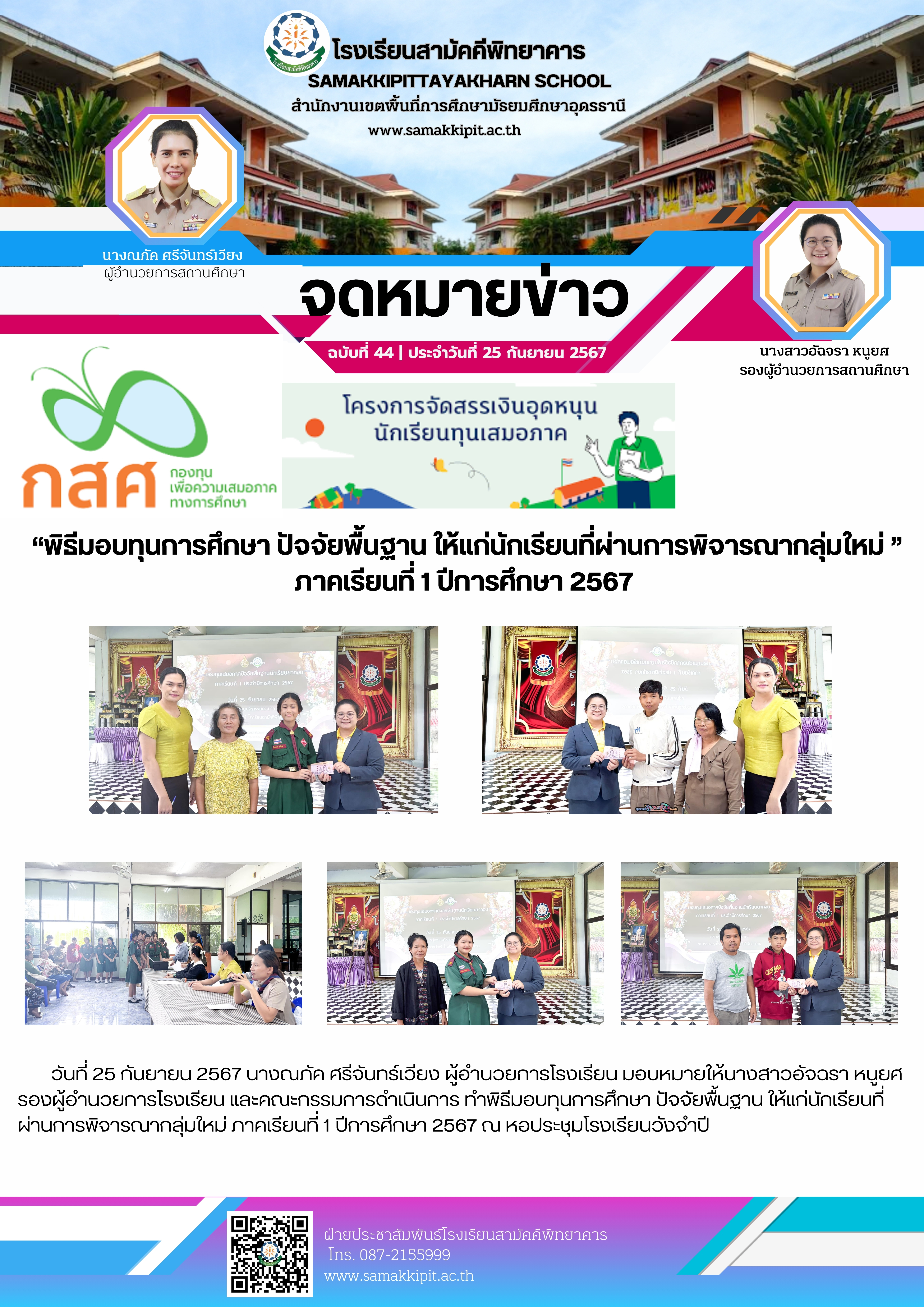 วันที่ 25 กันยายน 2567 นางณภัค ศรีจันทร์เวียง ผู้อำนวยการโรงเรียน มอบหมายให้นางสาวอัจฉรา หนูยศ รองผู้อำนวยการโรงเรียน และคณะกรรมการดำเนินการ ทำพิธีมอบทุนการศึกษา ปัจจัยพื้นฐาน ให้แก่นักเรียนที่