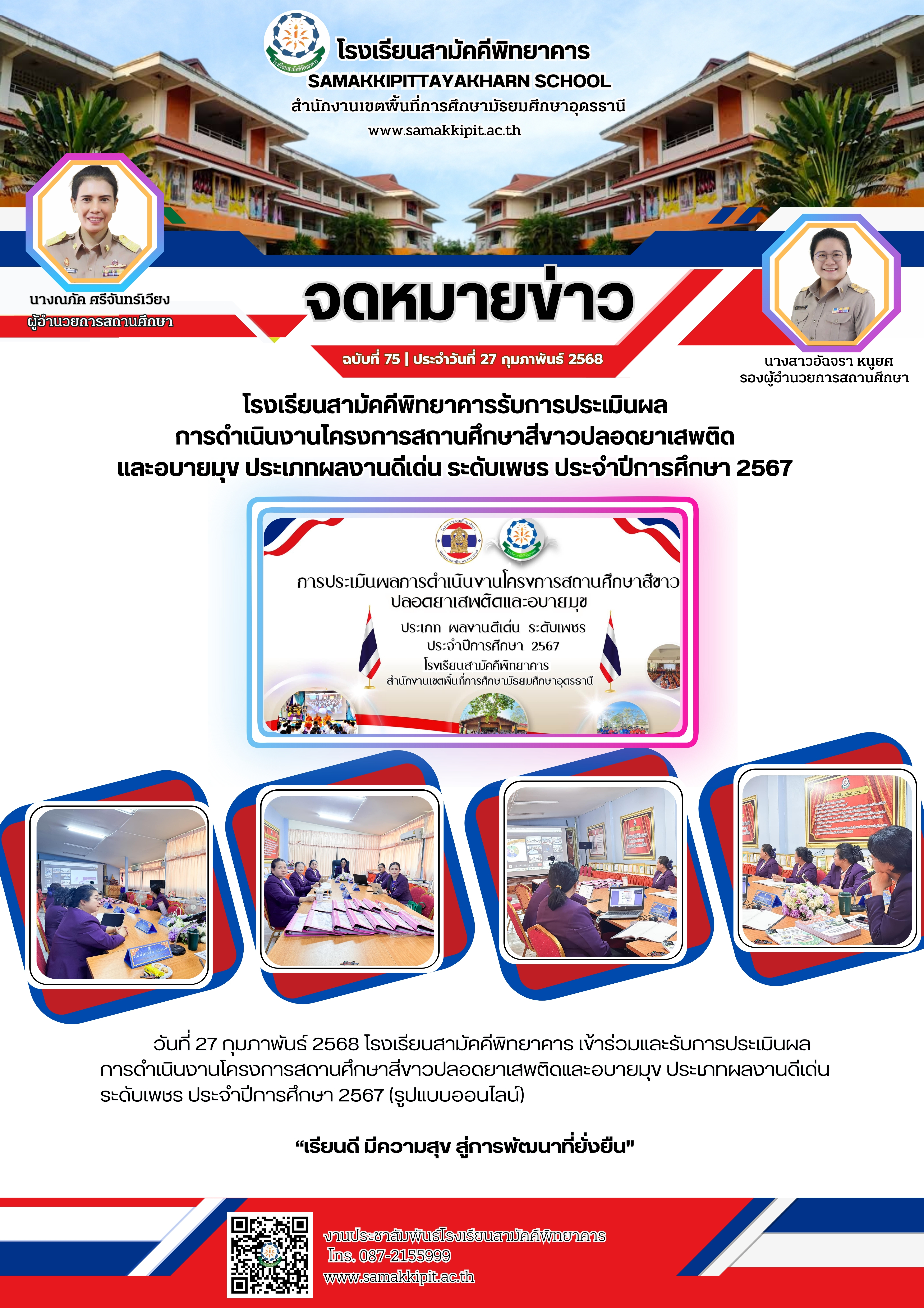 วันที่ 27 กุมภาพันธ์ 2568 โรงเรียนสามัคคีพิทยาคาร เข้าร่วมและรับการประเมินผล การดำเนินงานโครงการสถานศึกษาสีขาวปลอดยาเสพติดและอบายมุข ประเภทผลงานดีเด่น ระดับเพชร ประจำปีการศึกษา 2567 (รูปแบบออนไลน์)