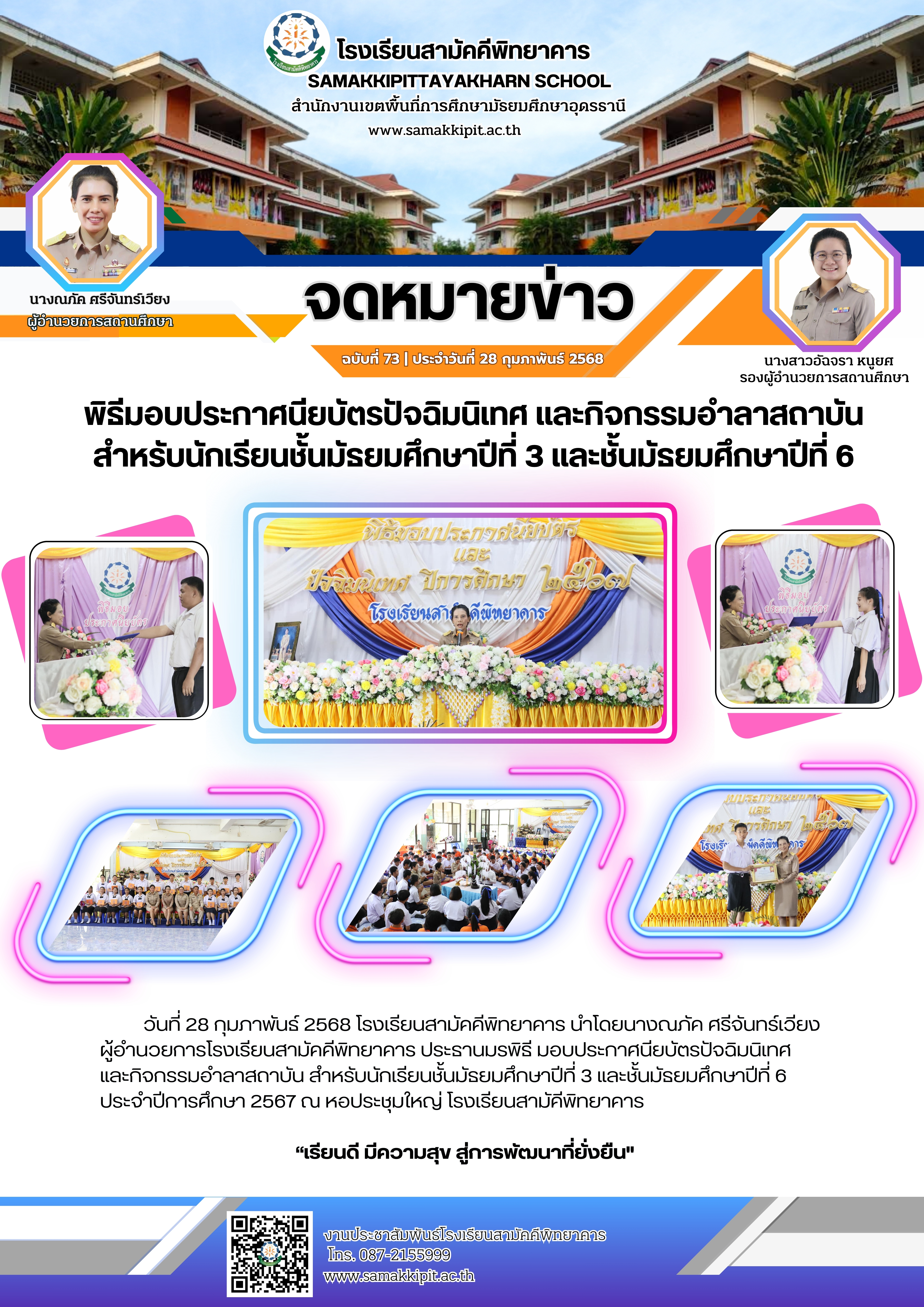 วันที่ 28 กุมภาพันธ์ 2568 โรงเรียนสามัคคีพิทยาคาร นำโดยนางณภัค ศรีจันทร์เวียง ผู้อำนวยการโรงเรียนสามัคคีพิทยาคาร ประธานมรพิธี มอบประกาศนียบัตรปัจฉิมนิเทศ และกิจกรรมอำลาสถาบัน สำหรับนักเรียนชั้นมัธยมศึกษาปีที่ 3 และชั้นมัธยมศึกษาปีที่ 6 ประจำปีการศึกษา 2567 ณ หอประชุมใหญ่ โรงเรียนสามัคีพิทยาคาร“เรียนดี มีความสุข สู่การพัฒนาที่ยั่งยืน"