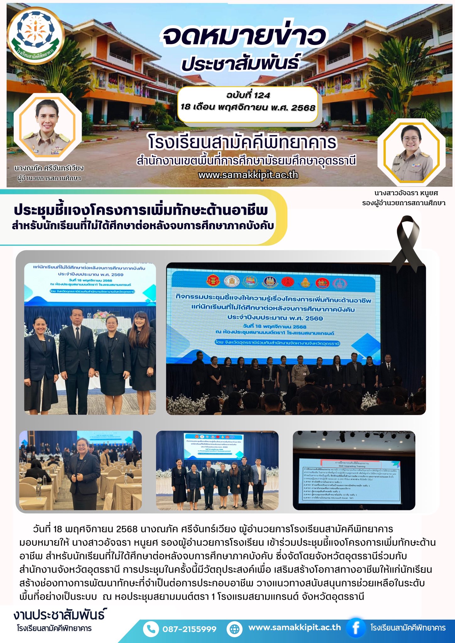 วันที่ 18 พฤศจิกายน 2568 นางณภัค ศรีจันทร์เวียง ผู้อำนวยการโรงเรียนสามัคคีพิทยาคาร มอบหมายให้ นางสาวอัจฉรา หนูยศ รองผู้อำนวยการโรงเรียน เข้าร่วมประชุมชี้แจงโครงการเพิ่มทักษะด้านอาชีพ สำหรับนักเรียนที่