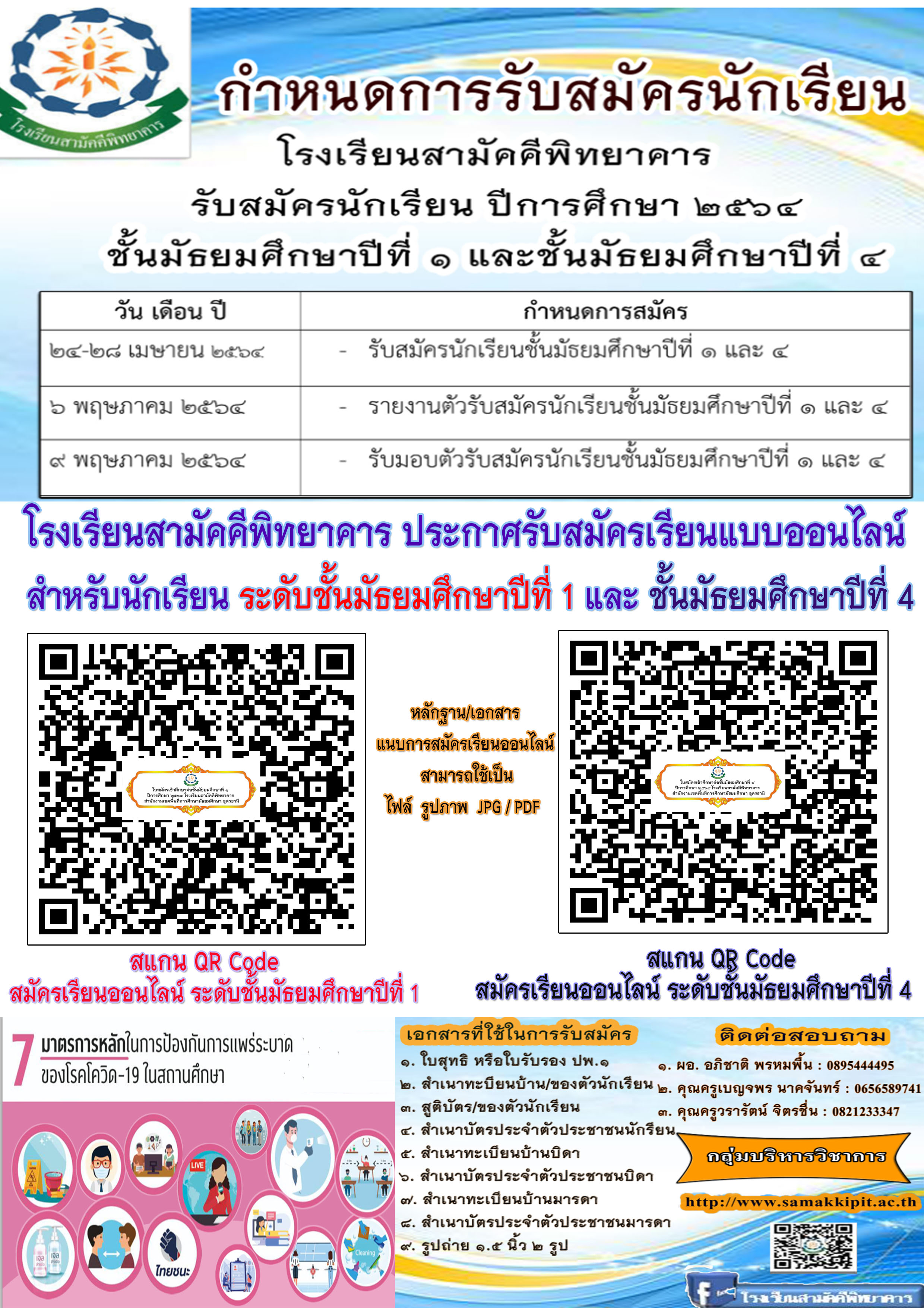 ประการรับสมัครนักเรียนใหม่เข้าศึกษาต่อระดับมัธยมศึกษาปีที่1 และชั้นมัธยมศึกษาปีที4 แบบออนไลน์ ประจำปีการศึกษา 2564 กลุ่มงานวิชาการ โรงเรียนสามัคคีพิทยาคาร