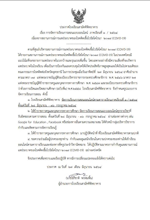 ประกาศโรงเรียนสามัคคีพิทยาคาร จัดการเรียนการสอนแบบออนไลน์ภาคเรียนที่ 1 ปีการศึกษา 2564 เนื่องจากการแพร่ระบาดของโรคไวรัสโคโรน่า19