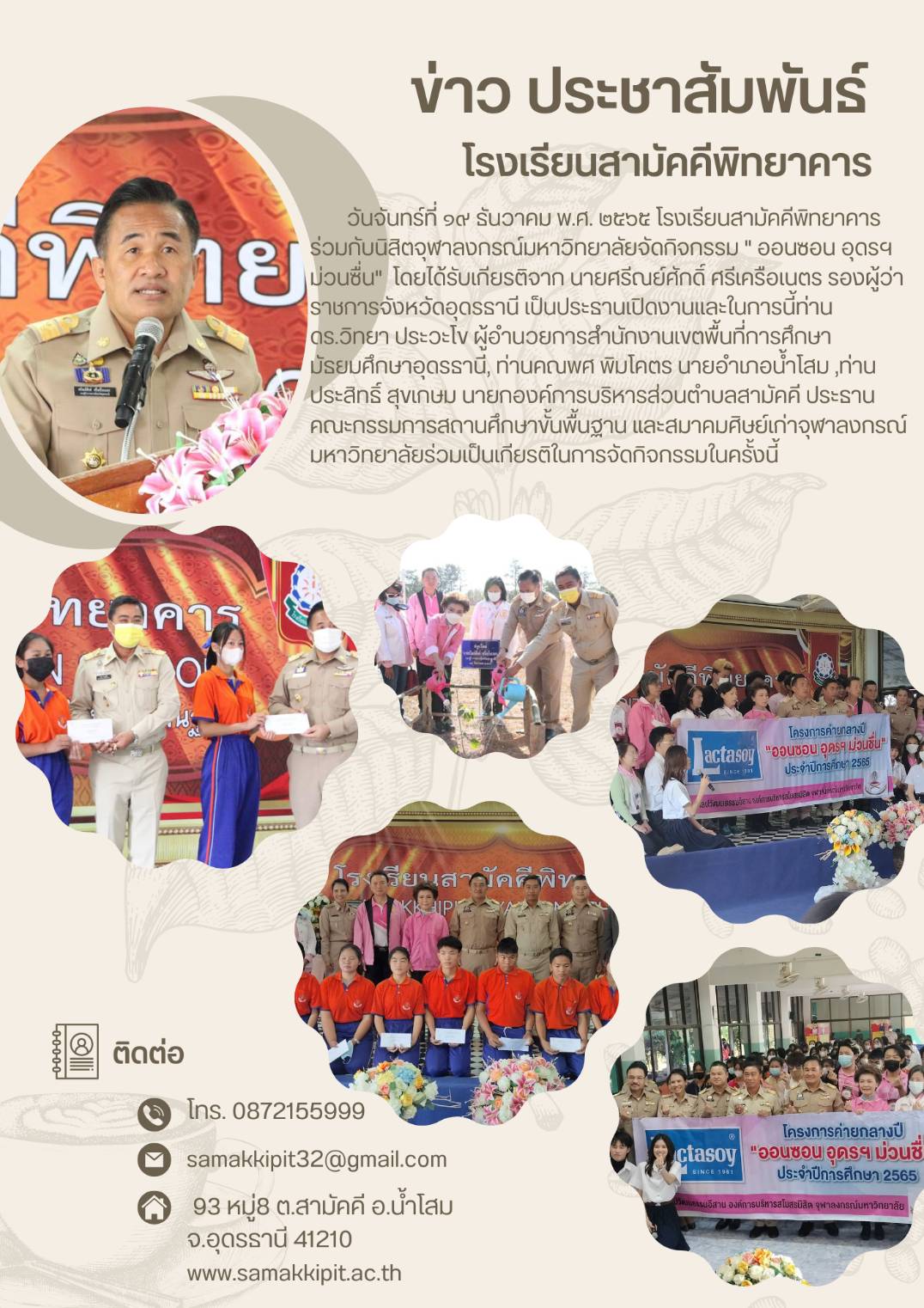 วันจันทร์ที่ ๑๙ ธันวาคม พ.ศ. ๒๕๖๕ โรงเรียนสามัคคีพิทยาคาร ร่วมกับนิสิตจุฬาลงกรณ์มหาวิทยาลัยจัดกิจกรรม " ออนซอน อุดรฯ ม่วนซื่น" โดยได้รับเกียรติจาก นายศรีณย์ศักดิ์ ศรีเครือเนตร รองผู้ว่าราชการจังหวัดอุดรธานี เป็นประธานเปิดงานและในการนี้ท่าน ดร.วิทยา ประวะโข ผู้อำนวยการสำนักงานเขตพื้นที่การศึกษามัธยมศึกษาอุดรธานี, ท่านคณพส พิมโคตร นายอำเภอน้ำโสม ,ท่านประสิทธิ์ สุขเกษม นายกองค์การบริหารส่วนตำบลสามัคคี ประธานคณะกรรมการสถานศึกษาขั้นพื้นฐาน และสมาคมศิษย์เก่าจุฬาลงกรณ์มหาวิทยาลัยร่วมเป็นเกียรติในการจัดกิจกรรมในครั้งนี้