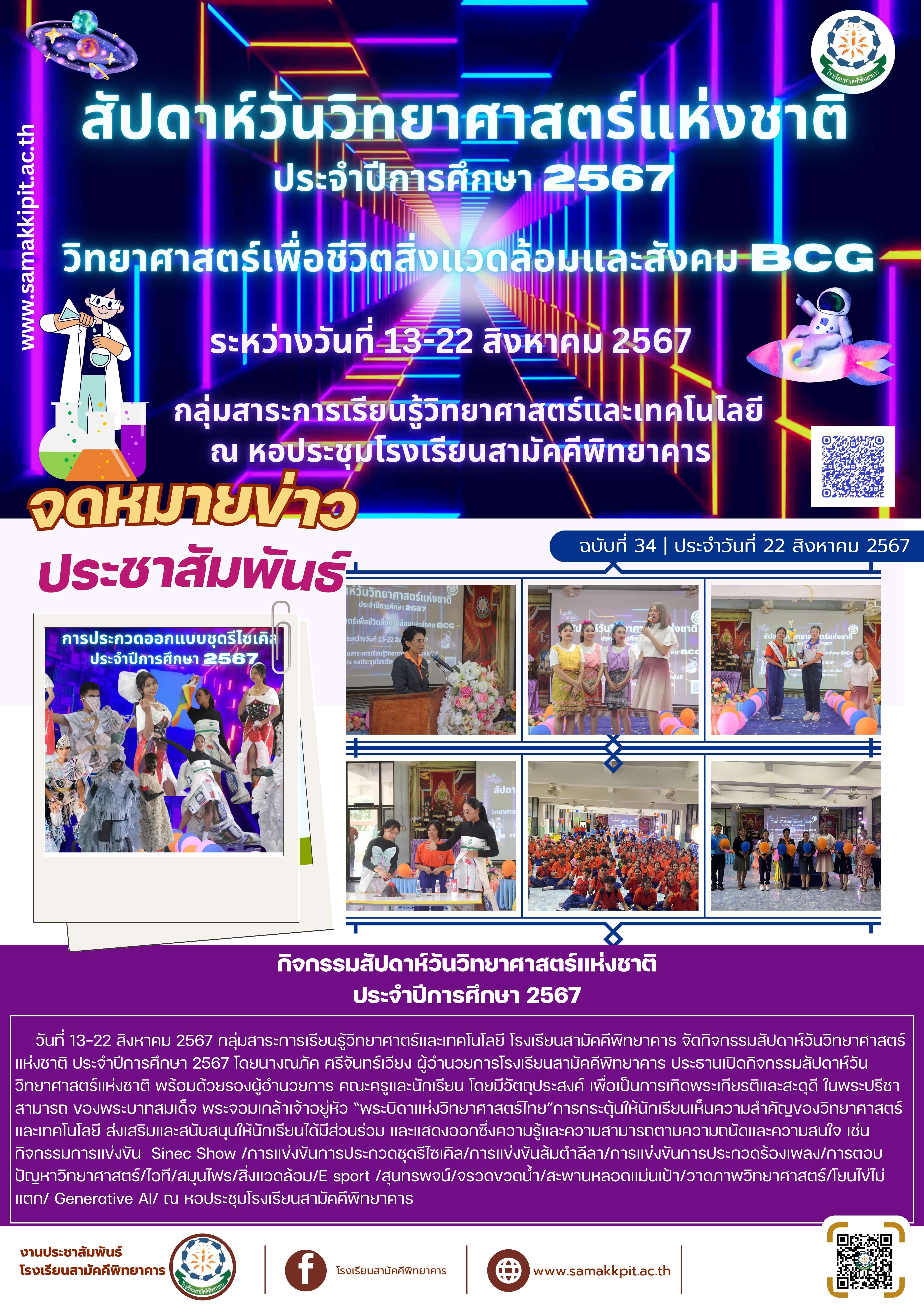 วันที่ 13-22 สิงหาคม 2567 กลุ่มสาระการเรียนรู้วิทยาศาตร์และเทคโนโลยี โรงเรียนสามัคคีพิทยาคาร จัดกิจกรรมสัปดาห์วันวิทยาศาสตร์แห่งชาติ ประจำปีการศึกษา 2567 โดยนางณภัค ศรีจันทร์เวียง ผู้อำนวยการโรงเรียนส