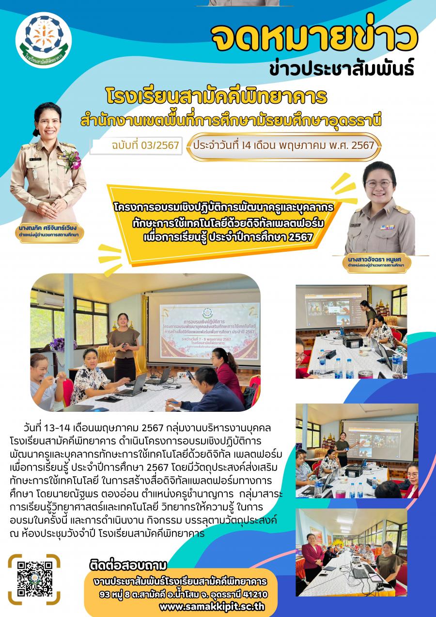 โครงการอบรมเชิงปฏิบัติการพัฒนาครูและบุคลากรทักษะการใช้เทคโนโลยีด้วยดิจิทัล เพลตฟอร์มเพื่อการเรียนรู้ ประจำปีการศึกษา 2567
