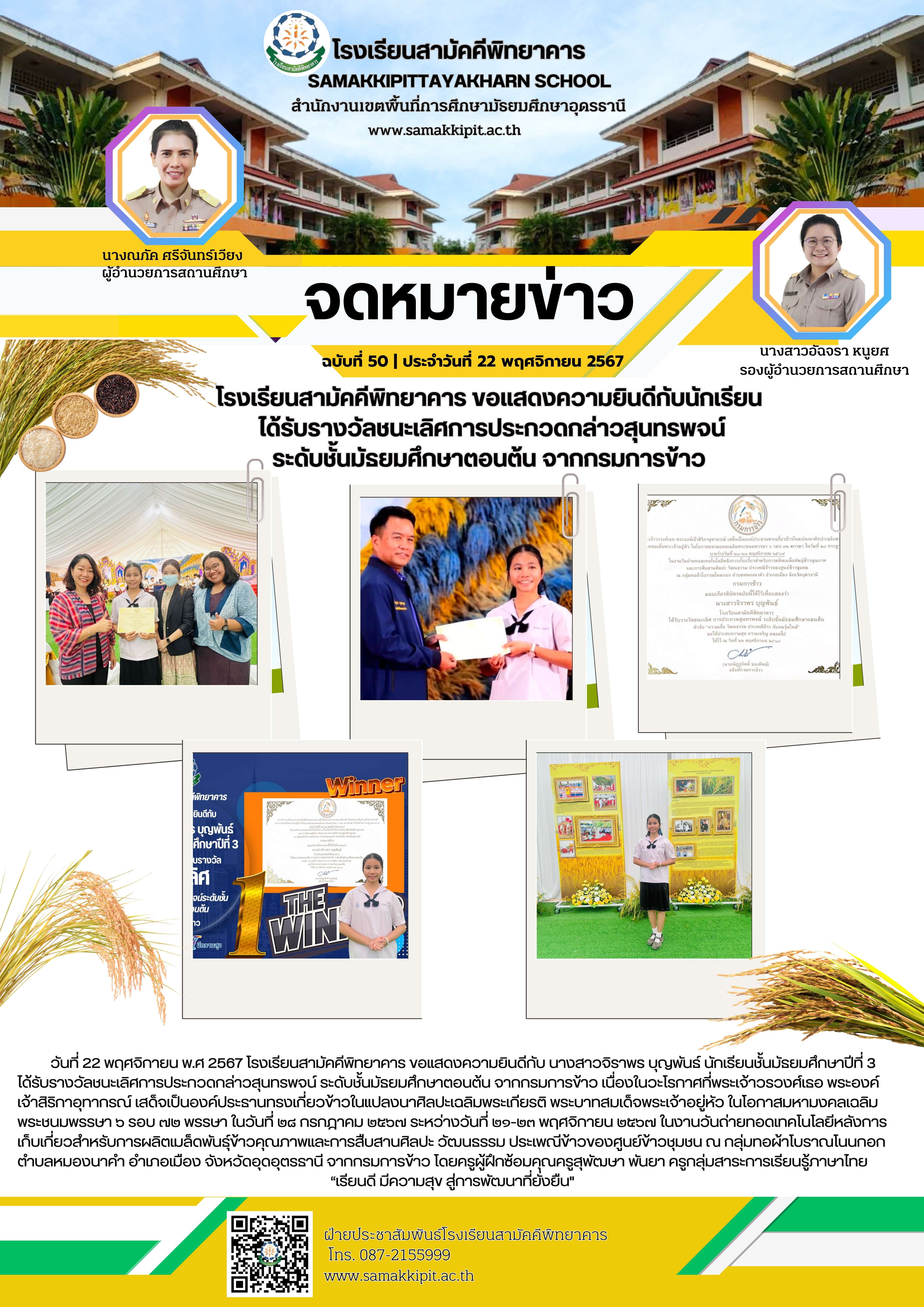 โรงเรียนสามัคคีพิทยาคาร ขอแสดงความยินดีกับนักเรียนชั้นมัธยมศึกษาปีที่ 3 ได้รับรางวัลชนะเลิศการประกวดกล่าวสุนทรพจน์ ระดับชั้นมัธยมศึกษาตอนต้น จากกรมการข้าว